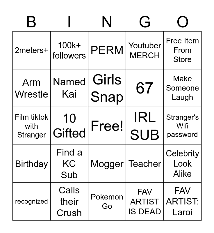 This bingo card has a free space and 24 words: recognized, Find a KC Sub, Girls Snap, FAV ARTIST IS DEAD, Free Item From Store, 2meters+, 100k+ followers, PERM, IRL SUB, Stranger's Wifi password, Film tiktok with Stranger, Named Kai, Teacher, Celebrity Look Alike, Arm Wrestle, Calls their Crush, Pokemon Go, Youtuber MERCH, Make Someone Laugh, Birthday, 10 Gifted, Mogger, 67 and FAV ARTIST: Laroi.