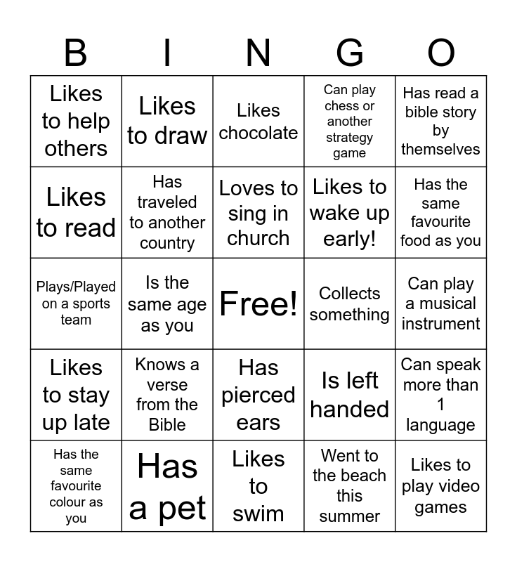 This bingo card has a free space and 24 words: Knows a verse from the Bible, Has a pet, Loves to sing in church, Has the same favourite colour as you, Has read a bible story by themselves, Likes to help others, Likes to read, Likes to draw, Collects something, Has pierced ears, Likes to wake up early!, Plays/Played on a sports team, Is left handed, Can speak more than 1 language, Has traveled to another country, Went to the beach this summer, Can play a musical instrument, Likes chocolate, Has the same favourite food as you, Is the same age as you, Likes to play video games, Likes to stay up late, Can play chess or another strategy game and Likes to swim.