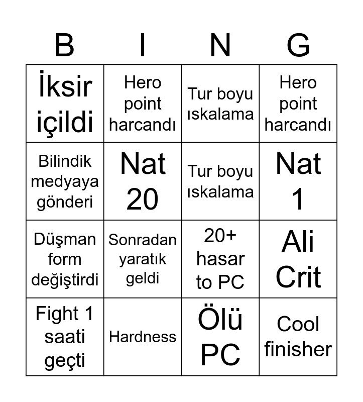 This bingo card has 16 words: Hardness, Ali Crit, Tur boyu ıskalama, İksir içildi, Düşman form değiştirdi, Hero point harcandı, 20+ hasar to PC, Ölü PC, Bilindik medyaya gönderi, Nat 20, Fight 1 saati geçti, Hero point harcandı, Sonradan yaratık geldi, Nat 1, Tur boyu ıskalama and Cool finisher.