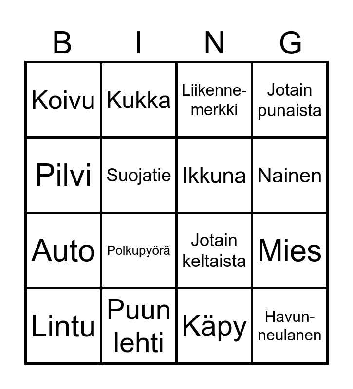 This bingo card has 17 words: Käpy, Lintu, Liikenne- merkki, Koivu, Polkupyörä, Jotain punaista, Mies, Ikkuna, Nainen, Suojatie, Puun lehti, Jotain keltaista, Pilvi, Kukka, Auto, Tyttö and Havun- neulanen.