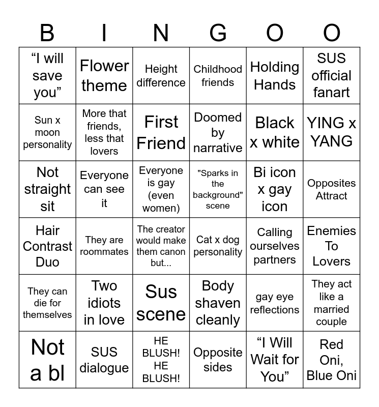This bingo card has 36 words: Body shaven cleanly, Sus scene, Opposite sides, Sun x moon personality, Hair Contrast Duo, "Sparks in the background" scene, More that friends, less that lovers, HE BLUSH! HE BLUSH!, Holding Hands, gay eye reflections, YING x YANG, Childhood friends, They act like a married couple, Everyone can see it, Doomed by narrative, “I will save you”, They can die for themselves, Bi icon x gay icon, Not straight sit, Height difference, Everyone is gay (even women), They are roommates, Cat x dog personality, The creator would make them canon but..., Calling ourselves partners, Flower theme, Black x white, SUS dialogue, First Friend, SUS official fanart, Red Oni, Blue Oni, Not a bl, Enemies To Lovers, Opposites Attract, Two idiots in love and “I Will Wait for You”.