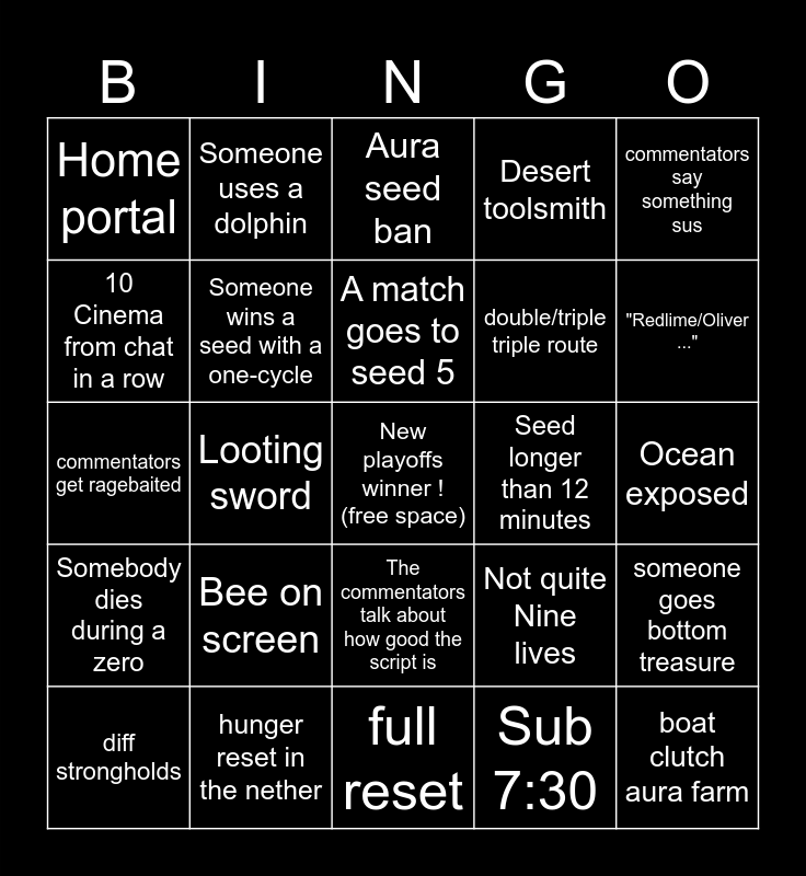 This bingo card has a free space and 35 words: A commentator says "Cinema", 2 + deaths in one seed (no hunger reset), Infume loses a seed, Someone wins a seed with a one-cycle, The commentators talk about how good the script is, Desert toolsmith, 10 Cinema from chat in a row, upset in match winner, A match goes to seed 5, 3-0, commentators get ragebaited, commentators say something sus, someone builds a neo on the fountain, First try flint, Home portal, Seed longer than 12 minutes, Sub 7:30, Looting sword, Somebody dies during a zero, boat clutch aura farm, Not quite Nine lives, diff strongholds, someone goes bottom treasure, hunger reset in the nether, Aura seed ban, "Redlime/Oliver ...", 2+2, Someone has to mine obby, double/triple triple route, Ocean exposed, Caved on blind, full reset, Bee on screen, Someone uses a dolphin and "Jakeing" mention.