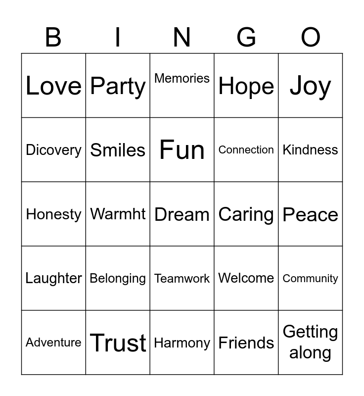 This bingo card has 34 words: Getting along, Friends, Happiness, Gathering, Laughter, Smiles, Joy, Adventure, Party, Celebration, Fun, Memories, Togetherness, Sharing, Caring, Kindness, Trust, Honesty, Belonging, Welcome, Teamwork, Support, Love, Peace, Harmony, Dream, Hope, Future, Connection, Dicovery, Openness, Warmht, Community and Good vibes.