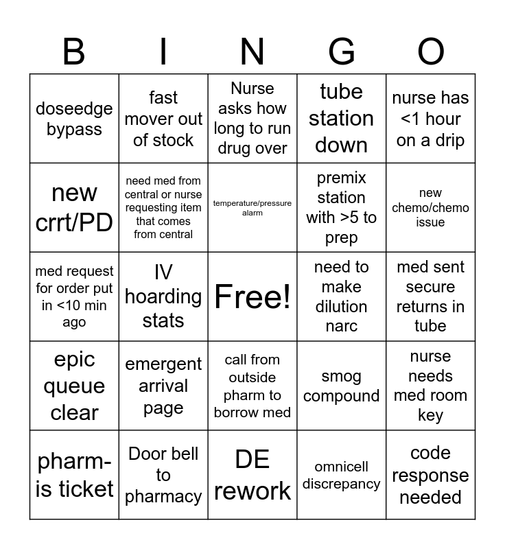This bingo card has a free space and 75 words: survanta, Pharmacist dispenses something to IV room that should be UD, Nurse asks how long to run drug over, missing lipid/adjust lipid time, Receive strange item in the tube, compatibility question, can I crush/does this go in a gtube, call out/or >10 min late, Empty bottle/box on shelf, Med message for missing cartfill item, TPN issue, stat alteplase, temperature/pressure alarm, new crrt/PD, D/C TPN, IV hoarding stats, calling central for PD, code response needed, picu missing med, nurse has <1 hour on a drip, move meds between omnicell, med request for order put in <10 min ago, need med from central or nurse requesting item that comes from central, fast mover out of stock, tube station down, miss-filled med, page on call, request for med to be tubed on do not tube list, retail (break-in, counseling, nurse calling wrong #), call to borrow a med, med message requesting drug in omnicell, need new tackle box, expired compound, smog compound, new chemo/chemo issue, premix station with >5 to prep, page or call NNP, rec from a consult service, med sent secure returns in tube, omnicell discrepancy, med not scanning (doseedge or nurse call), trauma B/stab code/OB c-section, expired med (not compound), call from OR, new DKA needs bags STAT, calling maintenance or environmental services, pharm-is ticket, doseedge bypass, unique name, brand new TPN, new LOS/EOS orders, call from outside pharm to borrow med, tube shut down for full tube, request for vfc vaccine, recon antibiotic, ID home med, status board clear, request for on call electrolytes, omnicell issue, med message requesting med scanned into med bin, emergent arrival page, albuterol syringe, rabies vaccine, phone call from MD needing dose recommendation, critical dose warning override, need to make dilution narc, med stored improperly, nurse calls and asks for med to be approved, extravasation question, nurse needs med room key, epic queue clear, Door bell to pharmacy, IV room calls out for stock, DE rework and need to waste for a narc.