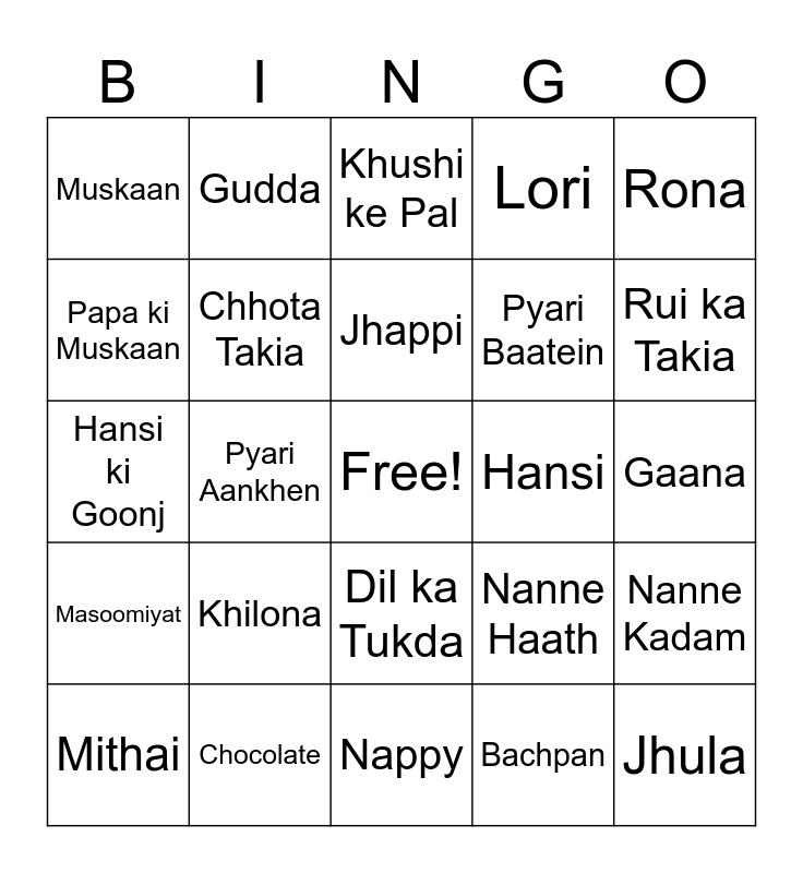 This bingo card has a free space and 50 words: Jhunjhuna, Jhula, Doodh ki Botal, Nappy, Khilona, Gudia, Gudda, Maa ka Pyaar, Papa ki Muskaan, Pehli Hansi, Chhota Takia, Lori, Nanne Kadam, Nanne Haath, Nanne Pair, Cartoon, Jhappi, Hansi, God, Rona, Pyari Aankhen, Bachpan, Muskaan, Pyari Baatein, Gale Lagana, Neend, Rui ka Takia, Khatiya, Khushi ke Pal, Dil ka Tukda, Jhappi, Doodh, Rajai, Takia, Chocolate, Toffee, Gubbare, Tara, Pari, Gaana, Jhoolna, Kahani, Sona, Chhota Sa Sapna, Mithai, Hansi ki Goonj, Pyara Chehra, Nanha Farishta, Masoomiyat and Aashirvaad.