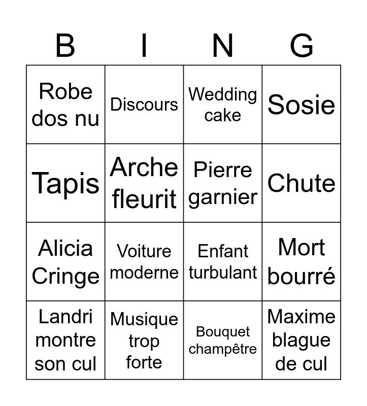 This bingo card has 16 words: Musique trop forte, Mort bourré, Wedding cake, Robe dos nu, Alicia Cringe, Discours, Enfant turbulant, Bouquet champêtre, Tapis, Arche fleurit, Landri montre son cul, Sosie, Voiture moderne, Chute, Pierre garnier and Maxime blague de cul.