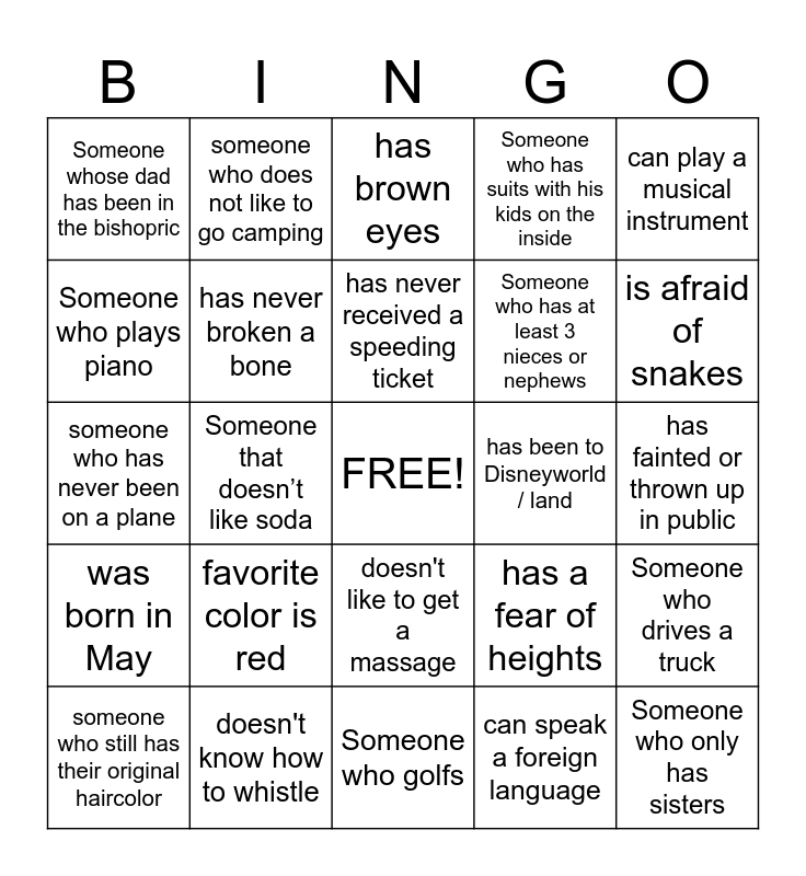 This bingo card has a free space and 34 words: born in another state, can speak a foreign language, someone who has 3 or more pets, likes to watch football, was born in May, has never broken a bone, can play a musical instrument, someone who still has their original haircolor, someone who does not like to go camping, has changed a tire on their own, has never received a speeding ticket, has brown eyes, can cross both eyes, someone who has five letters in their name, has been to Disneyworld / land, is afraid of snakes, doesn't know how to whistle, someone who has never been on a plane, favorite color is red, has a fear of heights, doesn't like to get a massage, is an only child, Someone whose dad has been in the bishopric, has fainted or thrown up in public, Someone who golfs, Someone who only has sisters, Someone who has suits with his kids on the inside, Someone who can sew, Someone who has at least 3 nieces or nephews, Someone who plays piano, Someone who wants a calling, Someone that doesn’t like soda, Someone who drives a truck and Someone who doesn’t have a car.