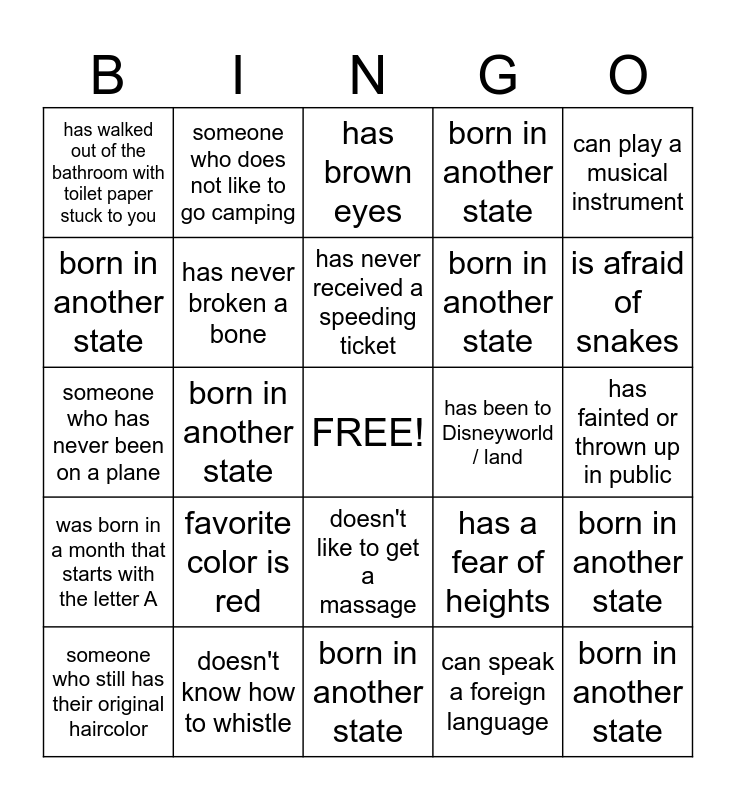 This bingo card has a free space and 34 words: born in another state, can speak a foreign language, someone who has 3 or more pets, likes to watch football, was born in a month that starts with the letter A, has never broken a bone, can play a musical instrument, someone who still has their original haircolor, someone who does not like to go camping, has changed a tire on their own, has never received a speeding ticket, has brown eyes, can cross both eyes, someone who has five letters in their name, has been to Disneyworld / land, is afraid of snakes, doesn't know how to whistle, someone who has never been on a plane, favorite color is red, has a fear of heights, doesn't like to get a massage, is an only child, has walked out of the bathroom with toilet paper stuck to you, has fainted or thrown up in public, born in another state, born in another state, born in another state, born in another state, born in another state, born in another state, born in another state, born in another state, born in another state and born in another state.
