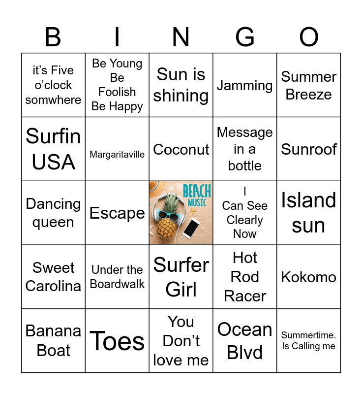 This bingo card has a free space and 53 words: I love beach music, Summertime. Is Calling me, Shama Lama Ding Dong, Ocean Blvd, Under the Boardwalk, Brown Eyed Girl, Be Young Be Foolish Be Happy, There Ain’t nothin like shaggin, Surfin USA, One Love People Get Ready, Margaritaville, Good Vibrations, Kokomo, Hot Rod Racer, Jump in Line, Banana Boat, Coconut, I Can See Clearly Now, Ocean Man, Summer Breeze, Escape, Island girl, Message in a bottle, it’s Five o’clock somwhere, Chicken fried, Toes, American kid, Written in the sand, Be like that, Sunroof, Why Kiki, Cool down, summertime, Beers and sunshine, Beachin, All summer, Jamming, You Don’t love me, Sun is shining, Murder she wrote, Pass the Dutchie, Summer Breaking, Island sun, Good Time, Cruise, Surfer Girl, Love Grows, Build me up buttercup, Dancing queen, Sweet Carolina, Right back where we started from, Boogie Shoes and Sugar Sugar.