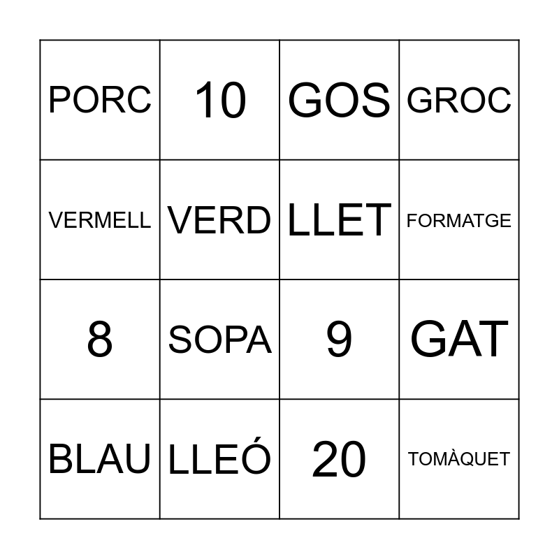 This bingo card has 16 words: LLEÓ, GAT, GOS, PORC, 8, 10, 9, 20, VERMELL, VERD, BLAU, GROC, SOPA, FORMATGE, LLET and TOMÀQUET.