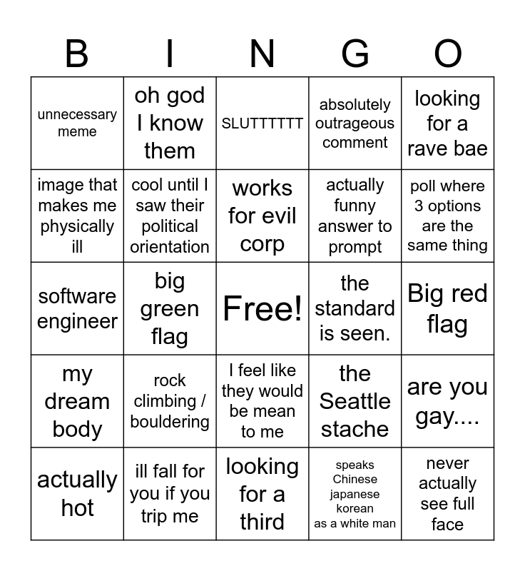 This bingo card has a free space and 24 words: rock climbing / bouldering, ill fall for you if you trip me, works for evil corp, actually hot, looking for a rave bae, unnecessary meme, image that makes me physically ill, oh god I know them, the standard is seen., I feel like they would be mean to me, actually funny answer to prompt, software engineer, the Seattle stache, are you gay...., cool until I saw their political orientation, speaks Chinese japanese korean as a white man, Big red flag, SLUTTTTTT, poll where 3 options are the same thing, big green flag, never actually see full face, my dream body, absolutely outrageous comment and looking for a third.