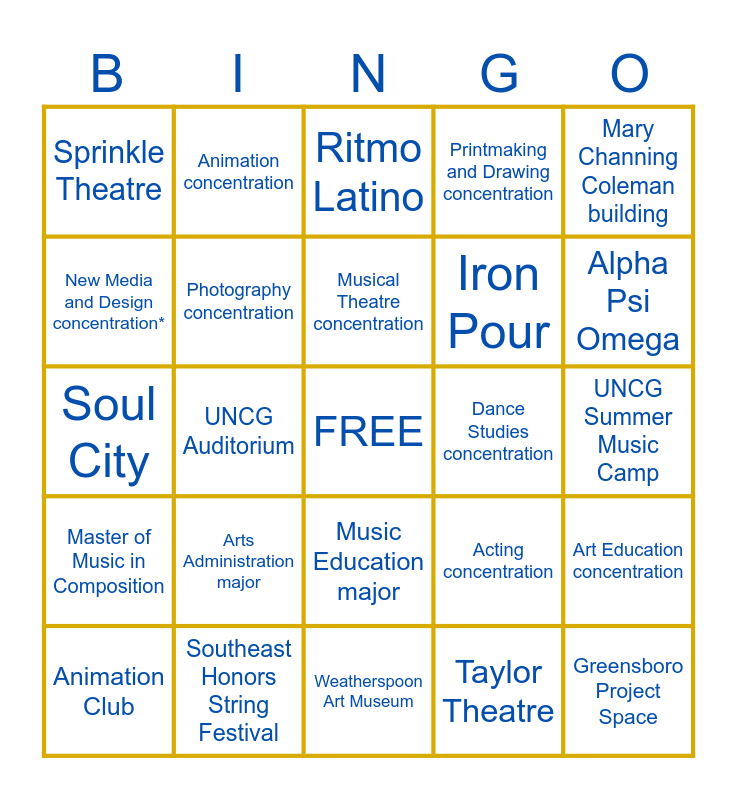 This bingo card has a free space and 47 words: Gatewood Building, Greensboro Project Space, Moore Building, Weatherspoon Art Museum, Arts Administration major, Art History concentration, Animation concentration, Ceramics and Sculpture concentration, New Media and Design concentration*, Painting concentration, Photography concentration, Printmaking and Drawing concentration, Art Education concentration, Acting concentration, Design and Technical Production concentration, Theatre Education concentration, Musical Theatre concentration, Dance Studies concentration, Pilates Certification Program, Mary Channing Coleman building, UNCG Auditorium, Taylor Theatre, Sprinkle Theatre, Iron Pour, The Artist’s Guild, Alpha Psi Omega, Animation Club, Performance major, Music Education major, Master of Music in Composition, Master of Music in Music Education, Master of Music in Music Theory, Clarinet Day, Double Reed Day, Keyboard Day, Southeast Honors String Festival, UNCG Summer Music Camp, Carmichael Studios, JALWA: Bollywood Dance Group, Make Cool Stuff, Prime Movers, Ritmo Latino, Soul City, SPARTA: The Hip Hop Dance Club, The Hook-Up, UNCG Theatrics and Note Control.