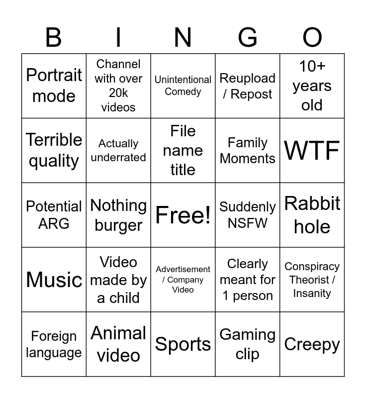This bingo card has a free space and 24 words: Video made by a child, Animal video, File name title, Foreign language, 10+ years old, Portrait mode, Terrible quality, Channel with over 20k videos, Suddenly NSFW, Advertisement / Company Video, Family Moments, Potential ARG, Clearly meant for 1 person, Conspiracy Theorist / Insanity, Actually underrated, Gaming clip, Rabbit hole, Unintentional Comedy, WTF, Nothing burger, Creepy, Music, Reupload / Repost and Sports.