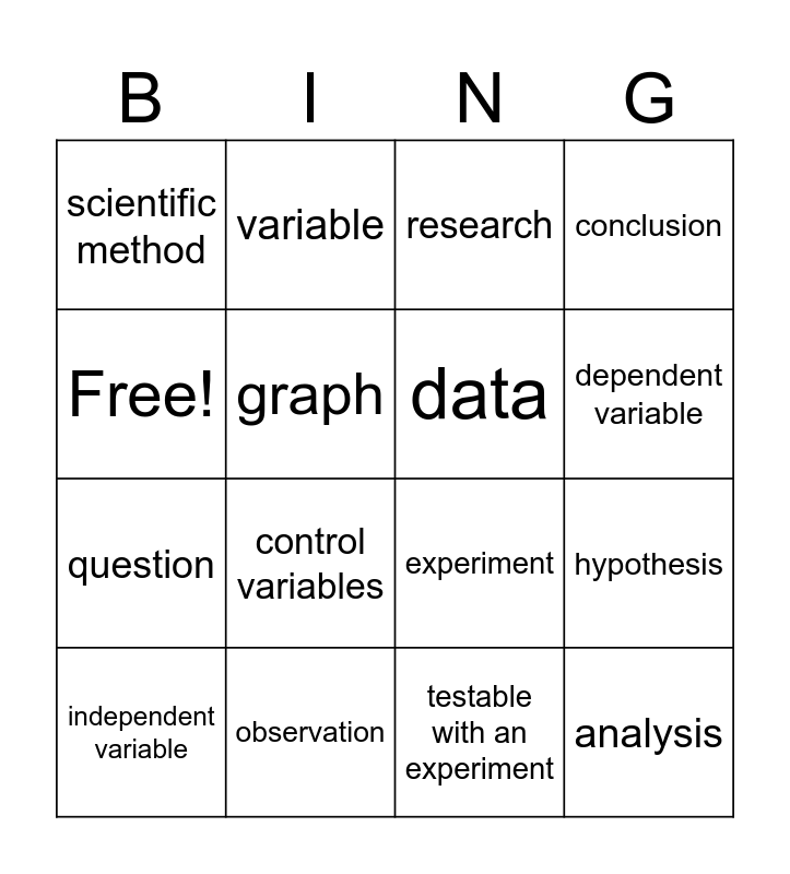 This bingo card has 16 words: observation, hypothesis, research, scientific method, question, variable, experiment, testable with an experiment, Free!, graph, independent variable, conclusion, control variables, dependent variable, data and analysis.