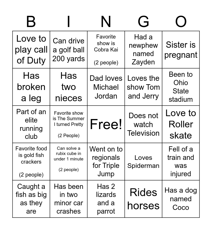 This bingo card has a free space and 24 words: Can solve a rubix cube in under 1 minute (2 people), Has been in two minor car crashes, Dad loves Michael Jordan, Caught a fish as big as they are, Sister is pregnant, Love to play call of Duty, Has broken a leg, Can drive a golf ball 200 yards, Does not watch Television, Went on to regionals for Triple Jump, Loves the show Tom and Jerry, Part of an elite running club, Loves Spiderman, Fell of a train and was injured, Has two nieces, Rides horses, Love to Roller skate, Favorite show is Cobra Kai (2 people), Been to Ohio State stadium, Favorite show is The Summer I turned Pretty (2 People), Has a dog named Coco, Favorite food is gold fish crackers (2 people), Had a newphew named Zayden and Has 2 lizards and a parrot.