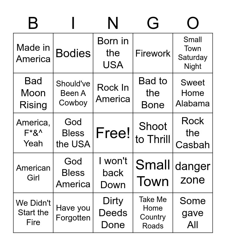 This bingo card has a free space and 30 words: Have you Forgotten, American Soldier, God Bless the USA, Courtesy of the Red White and Blue, Made in America, Born in the USA, Should've Been A Cowboy, I won't back Down, Shoot to Thrill, Dirty Deeds Done, Rock the Casbah, Some gave All, Take Me Home Country Roads, All American Girl, Sweet Home Alabama, Beer For My Horses, Small Town, American Girl, God Bless America, Small Town Saturday Night, America, F*&^ Yeah, Thunderstruck, Bodies, Bad to the Bone, Bad Moon Rising, Firework, danger zone, We Didn't Start the Fire, Rock In America and Mama I'm Coming Home.