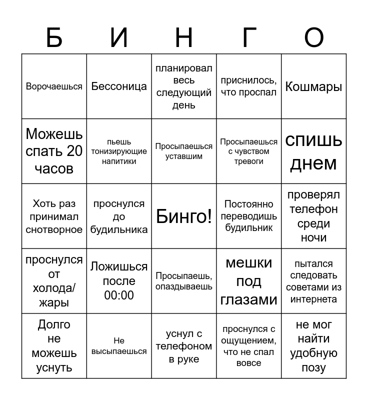 This bingo card has a free space and 24 words: Ложишься после 00:00, Не высыпаешься, Просыпаешься уставшим, Долго не можешь уснуть, Кошмары, Ворочаешься, Можешь спать 20 часов, Бессоница, Постоянно переводишь будильник, Просыпаешь, опаздываешь, Просыпаешься с чувством тревоги, Хоть раз принимал снотворное, мешки под глазами, пытался следовать советами из интернета, пьешь тонизирующие напитики, проснулся с ощущением, что не спал вовсе, проверял телефон среди ночи, планировал весь следующий день, спишь днем, проснулся до будильника, не мог найти удобную позу, проснулся от холода/жары, приснилось, что проспал and уснул с телефоном в руке.
