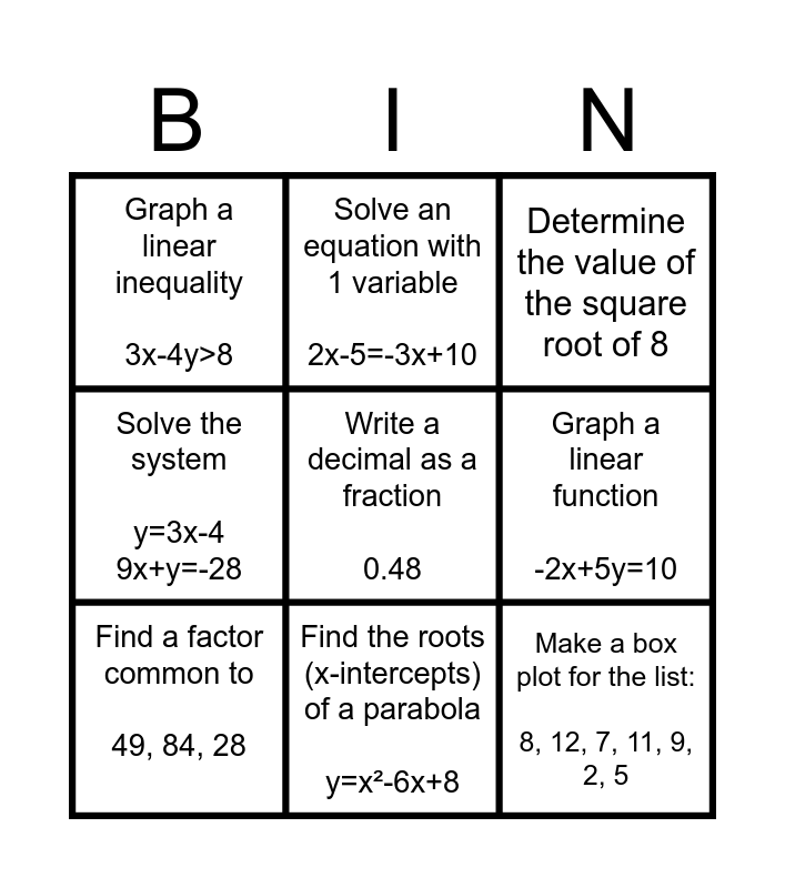 This bingo card has 9 words: Find a factor common to 49, 84, 28, Determine the value of the square root of 8, Solve an equation with 1 variable 2x-5=-3x+10, Solve the system y=3x-4 9x+y=-28, Graph a linear inequality 3x-4y>8, Graph a linear function -2x+5y=10, Write a decimal as a fraction 0.48, Make a box plot for the list: 8, 12, 7, 11, 9, 2, 5 and Find the roots (x-intercepts) of a parabola y=x²-6x+8.