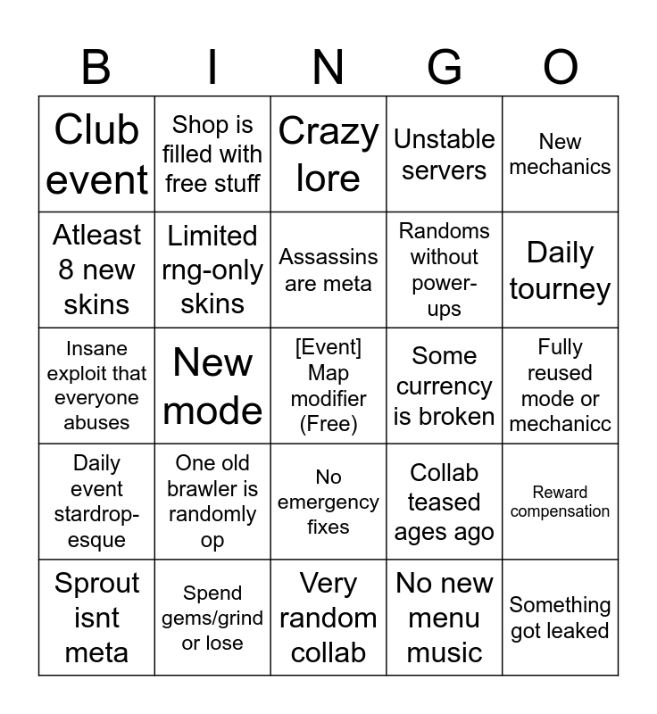 This bingo card has a free space and 24 words: One old brawler is randomly op, Spend gems/grind or lose, Assassins are meta, Sprout isnt meta, New mechanics, Club event, Atleast 8 new skins, Shop is filled with free stuff, Some currency is broken, No emergency fixes, Randoms without power-ups, Insane exploit that everyone abuses, Collab teased ages ago, Reward compensation, Limited rng-only skins, No new menu music, Fully reused mode or mechanicc, Crazy lore, Daily tourney, New mode, Something got leaked, Daily event stardrop-esque, Unstable servers and Very random collab.