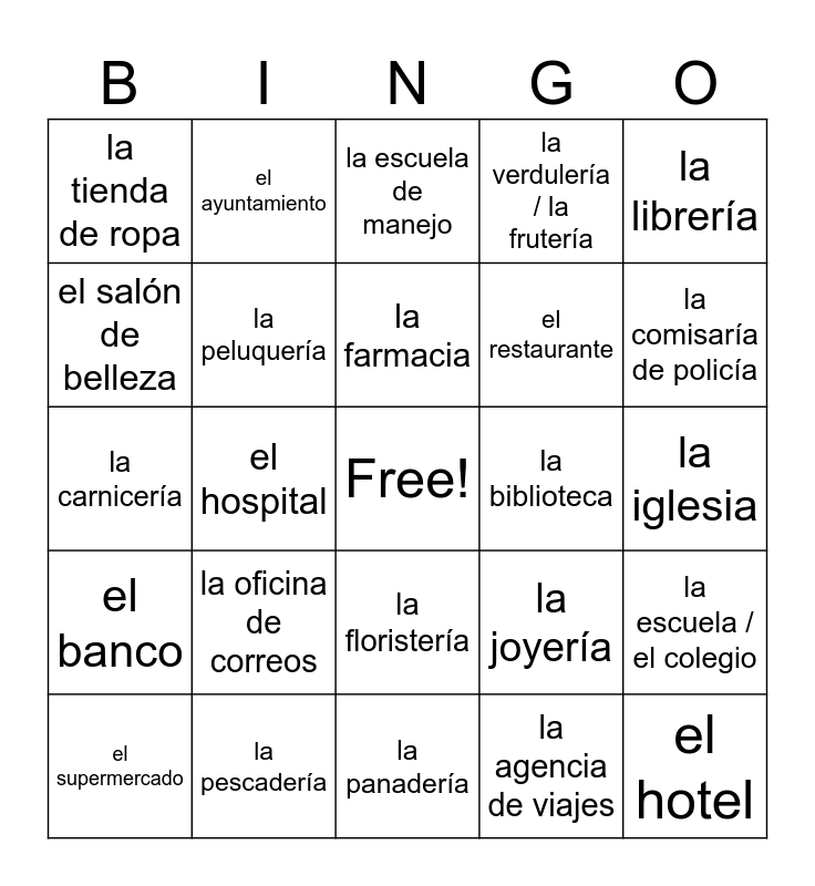 This bingo card has a free space and 28 words: la escuela / el colegio, la cafetería, el restaurante, la agencia de viajes, el salón de belleza, la escuela de manejo, el ayuntamiento, el banco, la biblioteca, el supermercado, la carnicería, la verdulería / la frutería, la pescadería, la panadería, la comisaría de policía, el estanco, la oficina de correos, la peluquería, la farmacia, la floristería, la tienda de ropa, la herboristería, el hotel, el hospital, la iglesia, la joyería, la librería and la gasolinera.