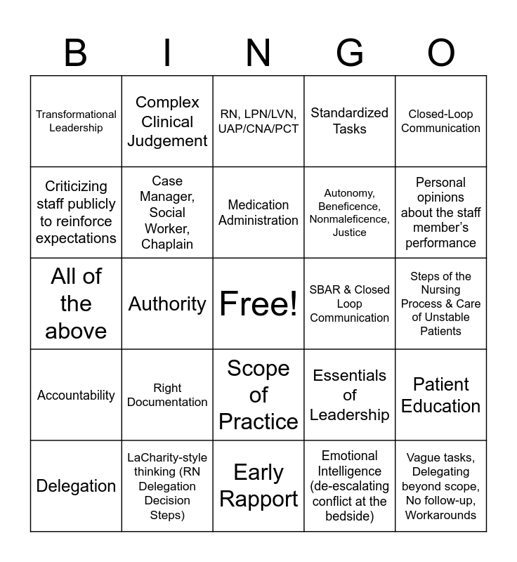 This bingo card has a free space and 29 words: Delegation, Supervision, Authority, Responsibility, Transformational Leadership, RN, LPN/LVN, UAP/CNA/PCT, Case Manager, Social Worker, Chaplain, Right Documentation, SBAR & Closed Loop Communication, LaCharity-style thinking (RN Delegation Decision Steps), Steps of the Nursing Process & Care of Unstable Patients, Vague tasks, Delegating beyond scope, No follow-up, Workarounds, Early Rapport, Emotional Intelligence (de-escalating conflict at the bedside), Personal opinions about the staff member’s performance, Assignment, Scope of Practice, Accountability, Closed-Loop Communication, All of the above, Essentials of Leadership, Leading Change in Delegation & Workflow, Autonomy, Beneficence, Nonmaleficence, Justice, Criticizing staff publicly to reinforce expectations, Standardized Tasks, Complex Clinical Judgement, Patient Education, Medication Administration and Nurse Practice Act.