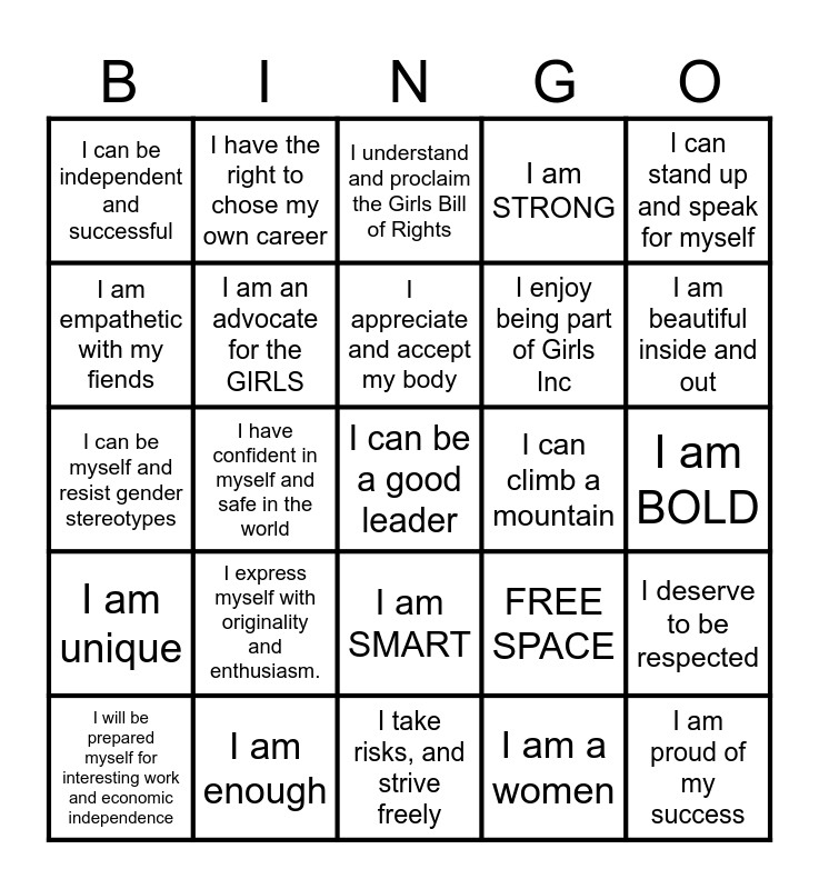 This bingo card has 25 words: I express myself with originality and enthusiasm., I take risks, and strive freely, I appreciate and accept my body, I will be prepared myself for interesting work and economic independence, I can stand up and speak for myself, I can be independent and successful, I am empathetic with my fiends, I have the right to chose my own career, I can climb a mountain, I am SMART, I enjoy being part of Girls Inc, I can be myself and resist gender stereotypes, FREE SPACE, I deserve to be respected, I am an advocate for the GIRLS, I am proud of my success, I am BOLD, I understand and proclaim the Girls Bill of Rights, I am beautiful inside and out, I have confident in myself and safe in the world, I can be a good leader, I am enough, I am unique, I am STRONG and I am a women.