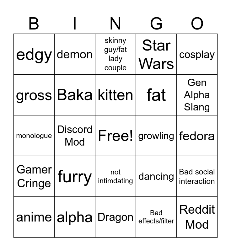 This bingo card has a free space and 24 words: furry, alpha, kitten, anime, cosplay, edgy, gross, demon, growling, not intimdating, fat, monologue, dancing, Bad social interaction, Baka, Bad effects/filter, fedora, skinny guy/fat lady couple, Gen Alpha Slang, Discord Mod, Reddit Mod, Gamer Cringe, Star Wars and Dragon.