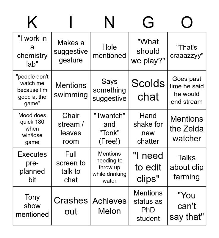 This bingo card has a free space and 48 words: "Dumb ____ for Babies", "You can't say that", Wears Bag, Achieves Melon, Full screen to talk to chat, Physically gets on bed, Makes a suggestive gesture, Donald Trump impression, "people don't watch me because I'm good at the game", Tells story involving family member/Emily, Mentions swimming, "What should we play?", Talks about clip farming, "I need to edit clips", "Stop it", Tells embarrassing story from past, Says something suggestive, Hand shake for new chatter, Tells tonk that twantch has Gamba, "That's craaazzyy", Chair stream / leaves room, Mentions status as PhD student, "I work in a chemistry lab", Scolds chat, Forgets to swap back to the correct screen/camera while gaming, Goes past time he said he would end stream, Tony show mentioned, Tries to justify Kitflation, Mentions needing to throw up while drinking water, Executes pre-planned bit, Eats glue, Asks chat to type "Chug", Opens or closes drawer, Get jebaited, Crashes out, Reminds chat of bag requirements, Mentions early days of streaming to just real life friends, Mentions the Zelda watcher, Gogurt deep throat, Angsts about stream insecurities, Says he's tired but continues streaming anyways, Flirts with friends, Hole mentioned, Trauma dumps, Mood does quick 180 when win/lose game, Makes excuse for no emotes, Chat perfectly times a sound effect and Threatens to time out chatter.