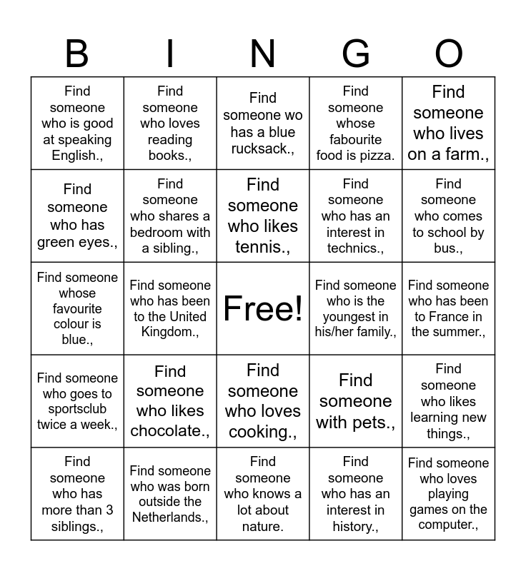 This bingo card has a free space and 24 words: Find someone who likes chocolate.,, Find someone who was born outside the Netherlands.,, Find someone who likes tennis.,, Find someone who has more than 3 siblings.,, Find someone who lives on a farm.,, Find someone who is good at speaking English.,, Find someone who has green eyes.,, Find someone who loves reading books.,, Find someone who is the youngest in his/her family.,, Find someone who loves cooking.,, Find someone who has an interest in technics.,, Find someone whose favourite colour is blue.,, Find someone with pets.,, Find someone who likes learning new things.,, Find someone who shares a bedroom with a sibling.,, Find someone who has an interest in history.,, Find someone who has been to France in the summer.,, Find someone wo has a blue rucksack.,, Find someone who comes to school by bus.,, Find someone who has been to the United Kingdom.,, Find someone who loves playing games on the computer.,, Find someone who goes to sportsclub twice a week.,, Find someone whose fabourite food is pizza. and Find someone who knows a lot about nature..