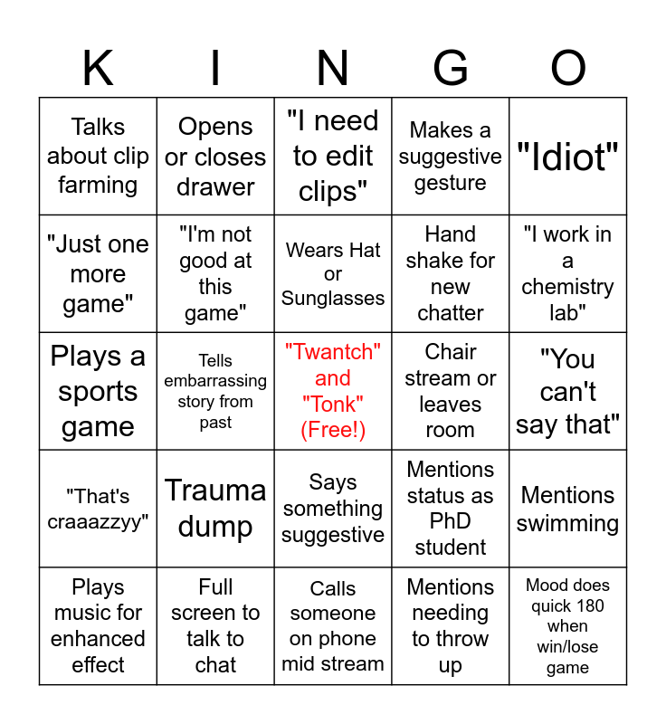 This bingo card has a free space and 69 words: "Dumb / Stupid ____ for Babies", "You can't say that", Wears Bag, Achieves Melon, Full screen to talk to chat, Physically gets on bed, Makes a suggestive gesture, Donald Trump impression, "Idiot", Tells story involving Emily, Mentions swimming, Bug in room, Talks about clip farming, "I need to edit clips", Eats glue, Tells embarrassing story from past, Says something suggestive, Hand shake for new chatter, "(Not) electric on the sticks", "That's craaazzyy", Chair stream or leaves room, Mentions status as PhD student, "I work in a chemistry lab", Scolds chat, Forgets to swap back to the correct screen/camera, "Ask me 5 questions", Tony show mentioned, Discusses Kitflation, Mentions needing to throw up, Executes pre-planned bit, Opens or closes drawer, Mentions Bingo (unprompted), Crashes out, Non sequitur / completely random comment, Mentions the early days of streaming, Gogurt deep throat, Angsts about stream insecurities, Plays longer than planned, "Just one more game", Hole mentioned, Trauma dump, Mood does quick 180 when win/lose game, "Not like this", Threatens to time out chatter, Silly voice / accent, Plays music for enhanced effect, Kit neggs self in response to compliment, Sock puppet, "I can fix this/her", "I'm not good at this game", Wears Hat or Sunglasses, Streaming in wrong category, "I'm cooked", Calls someone on phone mid stream, Gets 1000 point slither, Eats something on stream, "Unless.. unless.. unless.", Fake mustache, Minecraft mentioned, Plays a sports game, Zelda mentioned, Talks about dad, Alphabet Mexicans mentioned, Talks in third person, "Controller" issues, "Bad game, but good vibes", Kit wears grayscale shirt (black/ white/gray), High pitched voice and "Clip is flopping".
