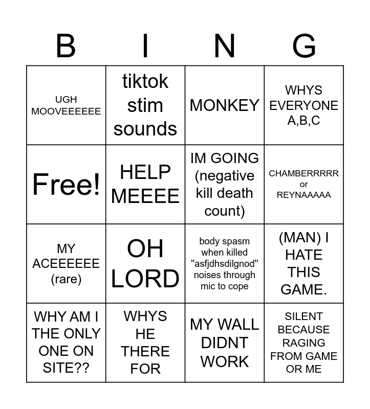 This bingo card has 16 words: WHYS HE THERE FOR, (MAN) I HATE THIS GAME., MONKEY, UGH MOOVEEEEEE, MY ACEEEEEE (rare), tiktok stim sounds, body spasm when killed ''asfjdhsdilgnod'' noises through mic to cope, MY WALL DIDNT WORK, Free!, HELP MEEEE, WHY AM I THE ONLY ONE ON SITE??, WHYS EVERYONE A,B,C, OH LORD, CHAMBERRRRR or REYNAAAAA, IM GOING (negative kill death count) and SILENT BECAUSE RAGING FROM GAME OR ME.