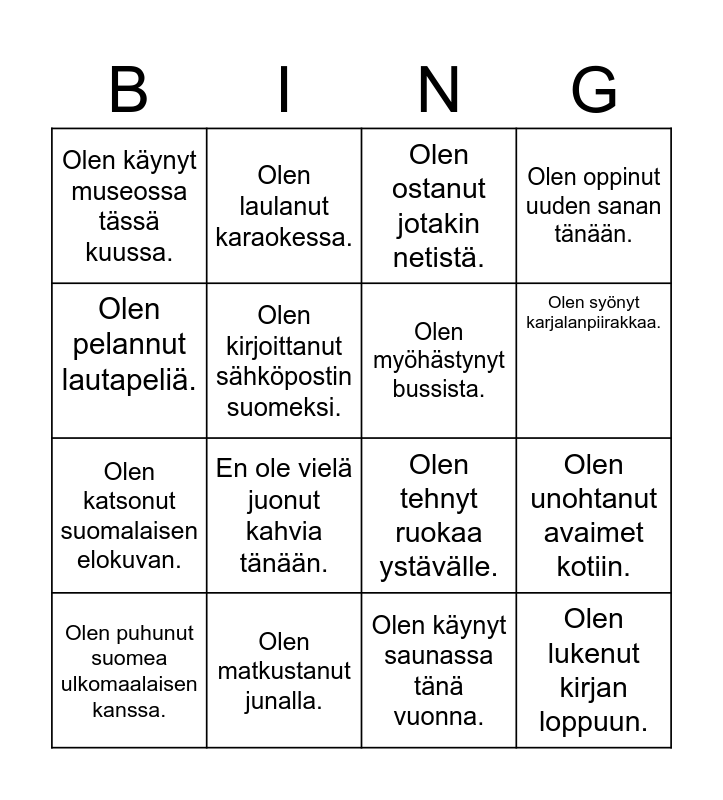 This bingo card has 16 words: Olen matkustanut junalla., Olen unohtanut avaimet kotiin., Olen ostanut jotakin netistä., Olen käynyt museossa tässä kuussa., Olen katsonut suomalaisen elokuvan., Olen laulanut karaokessa., Olen tehnyt ruokaa ystävälle., Olen käynyt saunassa tänä vuonna., Olen pelannut lautapeliä., Olen kirjoittanut sähköpostin suomeksi., Olen puhunut suomea ulkomaalaisen kanssa., Olen oppinut uuden sanan tänään., En ole vielä juonut kahvia tänään., Olen syönyt karjalanpiirakkaa., Olen myöhästynyt bussista. and Olen lukenut kirjan loppuun..