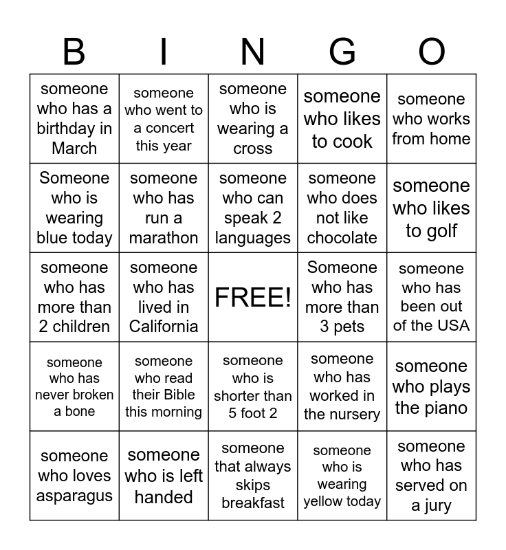 This bingo card has a free space and 24 words: someone who read their Bible this morning, someone who is left handed, someone who can speak 2 languages, someone who loves asparagus, someone who works from home, someone who has a birthday in March, Someone who is wearing blue today, someone who went to a concert this year, Someone who has more than 3 pets, someone who is shorter than 5 foot 2, someone who does not like chocolate, someone who has more than 2 children, someone who has worked in the nursery, someone who plays the piano, someone who has run a marathon, someone who is wearing yellow today, someone who has been out of the USA, someone who is wearing a cross, someone who likes to golf, someone who has lived in California, someone who has served on a jury, someone who has never broken a bone, someone who likes to cook and someone that always skips breakfast.