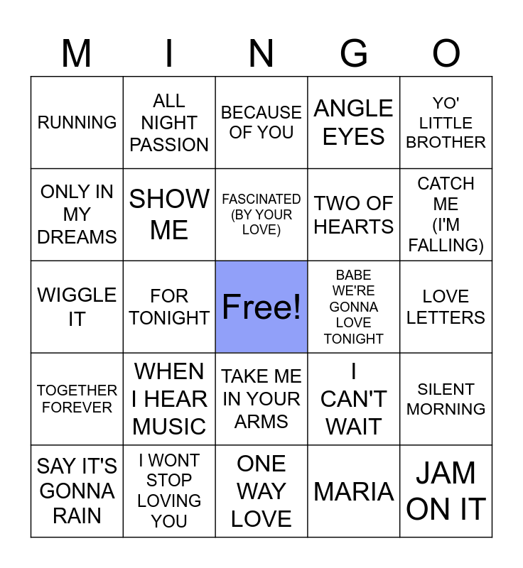 This bingo card has a free space and 49 words: HOW DID YOU KNOW?, JAM ON IT, GIVE ME TONIGHT, ONE WAY LOVE, WHEN I HEAR MUSIC, WHAT'S ON YOUR MIND, ALL NIGHT PASSION, POINT OF NO RETURN, ONLY IN MY DREAMS, SPRING LOVE (COME BACK TO ME), SHOW ME, ANGLE EYES, SILENT MORNING, I CAN'T WAIT, BOY I'VE BEEN TOLD, TELL IT TO MY HEART, FASCINATED (BY YOUR LOVE), BABE WE'RE GONNA LOVE TONIGHT, HUNGRY FOR YOUR LOVE, YO' LITTLE BROTHER, FOR TONIGHT, MARIA, RUNNING, TWO OF HEARTS, CAN YOU FEEL THE BEAT, CATCH ME (I'M FALLING), SAY IT'S GONNA RAIN, I WONDER IF I TAKE YOU HOME, TAKE ME IN YOUR ARMS, TOGETHER FOREVER, COME GO WITH ME, BAD OF THE HEART, TEMPTATION, I'LL BE ALL YOU EVER NEED, I WONT STOP LOVING YOU, PARTY YOUR BODY, DIAMOND GIRL, YO NO SE, LOVE LETTERS, BABY LOVE, ONE MORE TRY, TOUCH ME, I STILL BELIEVE, RELEASE YOURSELF, WIGGLE IT, BECAUSE OF YOU, LIKE A CHILD (AT PLAY), SCARS OF LOVE and LET THE BEAT HIM 'EM.