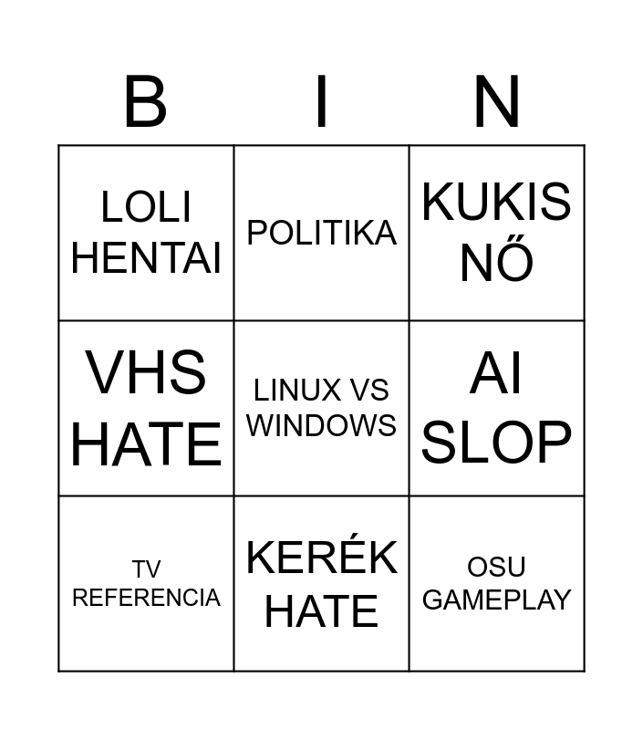 This bingo card has a free space and 8 words: AI SLOP, KUKIS NŐ, POLITIKA, TV REFERENCIA, LOLI HENTAI, OSU GAMEPLAY, VHS HATE and KERÉK HATE.