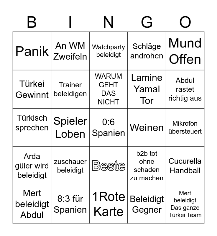 This bingo card has a free space and 34 words: Türkei Tor, Galatasaray und Fenerbahçe Streit, Auf Mutter gehen, Spanien gewinnt, Mikrofon übersteuert, Türkei Gewinnt, Trainer beleidigen, 1Rote Karte, Lamine Yamal Tor, Mert beleidigt Das ganze Türkei Team, Türkisch sprechen, An WM Zweifeln, Beleidigt Gegner, Sagt wala, Arda güler wird beleidigt, Spieler Loben, Beste, Weinen, Cucurella Handball, Mert beleidigt Abdul, 8:3 für Spanien, Deutschland beleidigen, Schläge androhen, Abdul rastet richtig aus, ja check ich, zuschauer beleidigt, Watchparty beleidigt, Zunge, Mund Offen, Panik, aufstehen, WARUM GEHT DAS NICHT, b2b tot ohne schaden zu machen and Erschrecken.