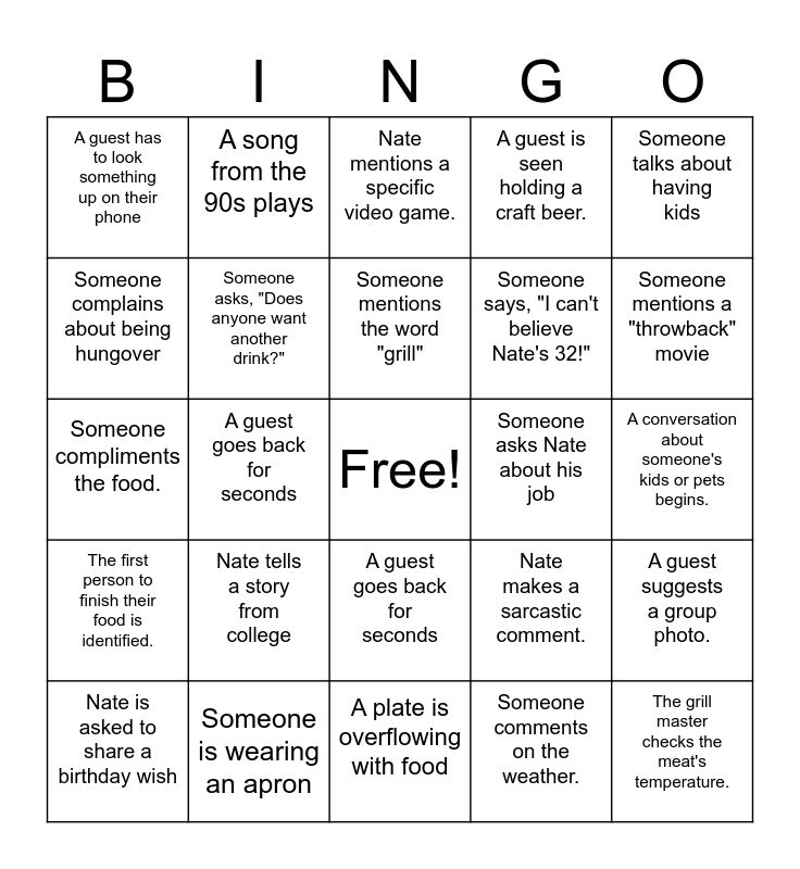 This bingo card has a free space and 24 words: Nate tells a story from college, Someone is wearing an apron, Someone mentions the word "grill", Nate is asked to share a birthday wish, Someone talks about having kids, A guest has to look something up on their phone, Someone complains about being hungover, A song from the 90s plays, Someone asks Nate about his job, A guest goes back for seconds, Someone says, "I can't believe Nate's 32!", Someone compliments the food., Nate makes a sarcastic comment., A guest suggests a group photo., Someone asks, "Does anyone want another drink?", Someone comments on the weather., A conversation about someone's kids or pets begins., Nate mentions a specific video game., Someone mentions a "throwback" movie, A guest goes back for seconds, The grill master checks the meat's temperature., The first person to finish their food is identified., A guest is seen holding a craft beer. and A plate is overflowing with food.