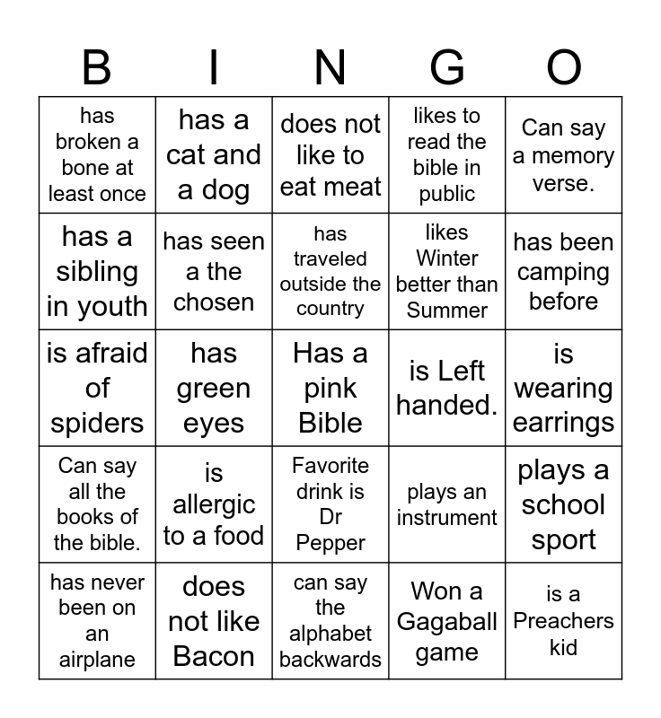 This bingo card has a free space and 24 words: is allergic to a food, does not like Bacon, has traveled outside the country, has never been on an airplane, Can say a memory verse., has broken a bone at least once, has a sibling in youth, has a cat and a dog, is Left handed., Favorite drink is Dr Pepper, likes Winter better than Summer, is afraid of spiders, plays an instrument, plays a school sport, has seen a the chosen, Won a Gagaball game, is wearing earrings, does not like to eat meat, has been camping before, has green eyes, is a Preachers kid, Can say all the books of the bible., likes to read the bible in public and can say the alphabet backwards.