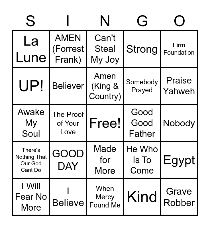 This bingo card has a free space and 85 words: Dusty Bibles, The Prodigal, Can't Steal My Joy, Gratitude, Talking to Jesus, 10,000 Reasons, Voice of Truth, Praise You in The Storm, Survivor, Multiplied, You Say, God Only Knows, Believer, Good Good Father, Come To The Table, La Lune, I Will Fear No More, UP!, All Praise, Enough, Glorious Day, Somebody Prayed, Grave Robber, Chain Breaker, The Proof of Your Love, Lord of All, Milk and Honey, Scars, Shoulders, Burn the Ships, GOOD DAY, Redeemed, Don't Stay Praying, Awake My Soul, Only Jesus, Because He Lives, When Mercy Found Me, One Thing Remains, There's Nothing That Our God Cant Do, Praise Yahweh, LEMONADE, Prove It, Unstoppable, Your Love, Great Light Of The World, Even If, Truth Be Told, Revolutionary, Show You The Cross, Say I Won't, AMEN (Forrest Frank), Amen (King & Country), My Jesus, NO LONGER BOUND, Ain't Nobody, Too Good To Not Believe, I Believe, Strong, This is Our God, Great Things, 1,000 Names, Honey In The Rock, King of Kings, A Thousand Hallelujahs, Take You At Your Word, Firm Foundation, Reckless Love, Egypt, The Blessing, Chasing Rebels, Walking Free, Oceans, Running Back to You, LION, Hard Fought Hallelujah, Made for More, Kind, Your Grace Finds Me, God That Saves, The Lord Will Provide, Nobody, Steady, Come As You Are, He Who Is To Come and Yes I Will.