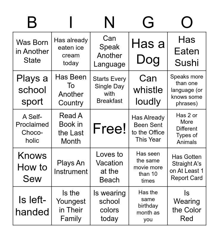 This bingo card has a free space and 40 words: An Avid Book Reader, A Self-Proclaimed Choco-holic, Fan of Football, Has Been To Another Country, Is the Youngest in Their Family, Loves to Vacation at the Beach, Starts Every Single Day with Breakfast, Would Rather Stay Up Late Than Get Up Early, Has Eaten Sushi, Knows How to Sew, Read A Book in the Last Month, Has a Dog, Is Wearing the Color Red, Has 2 or More Different Types of Animals, Has Already Been Sent to the Office This Year, Plays An Instrument, Has Been Fishing, Was Born in Another State, Loves To Shop, Can Speak Another Language, Has Gotten Straight A's on At Least 1 Report Card, Has the same birthday month as you, Can whistle loudly, Plays a school sport, Has been on an airplane, Can say the alphabet backwards, Has a younger sibling, Loves pineapple on pizza, Can name all 4 seasons in under 3 seconds, Knows how to juggle (or at least try), Has the same shoe size as you, Is left-handed, Can do a cartwheel, Has seen the same movie more than 10 times, Speaks more than one language (or knows some phrases), Is wearing school colors today, Has a pet that isn’t a dog or cat, Knows all the words to a TikTok dance, Has already eaten ice cream today and Goes to a different school than you.