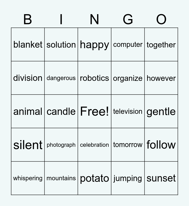 This bingo card has a free space and 24 words: photograph, mountains, robotics, whispering, together, blanket, division, solution, television, celebration, organize, animal, tomorrow, follow, dangerous, jumping, gentle, happy, however, candle, sunset, silent, computer and potato.
