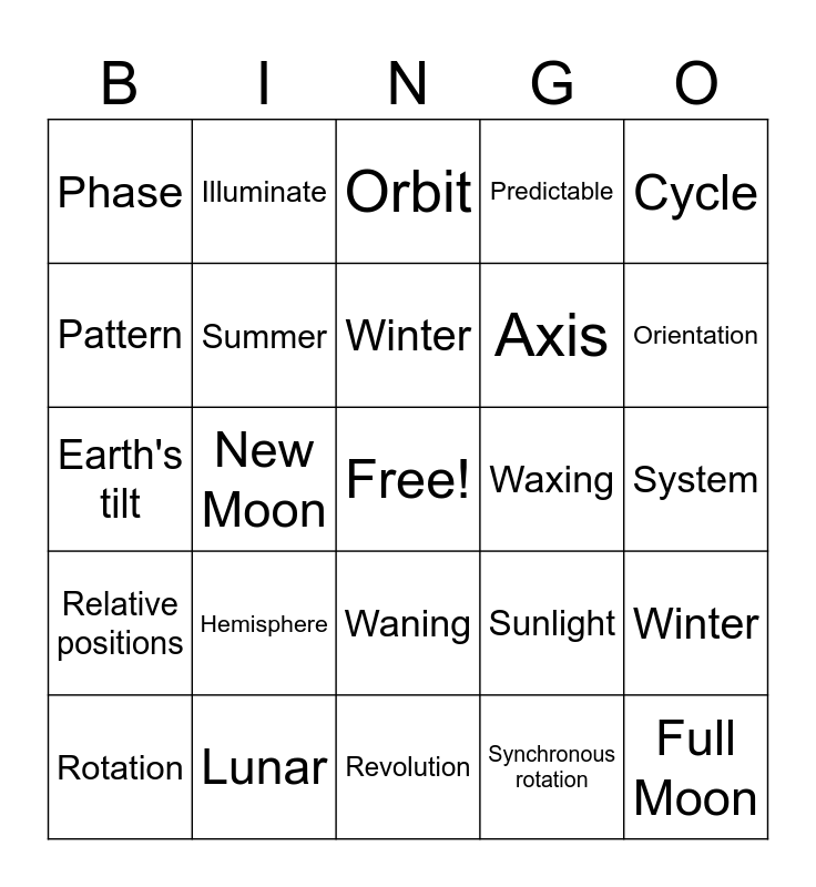 This bingo card has a free space and 25 words: Hemisphere, Revolution, Winter, Rotation, Cycle, Phase, Pattern, Illuminate, Waxing, Waning, Axis, Earth's tilt, Sunlight, Winter, Summer, Spring, Fall, System, Orbit, Orientation, New Moon, Full Moon, Lunar, Relative positions, Predictable and Synchronous rotation.