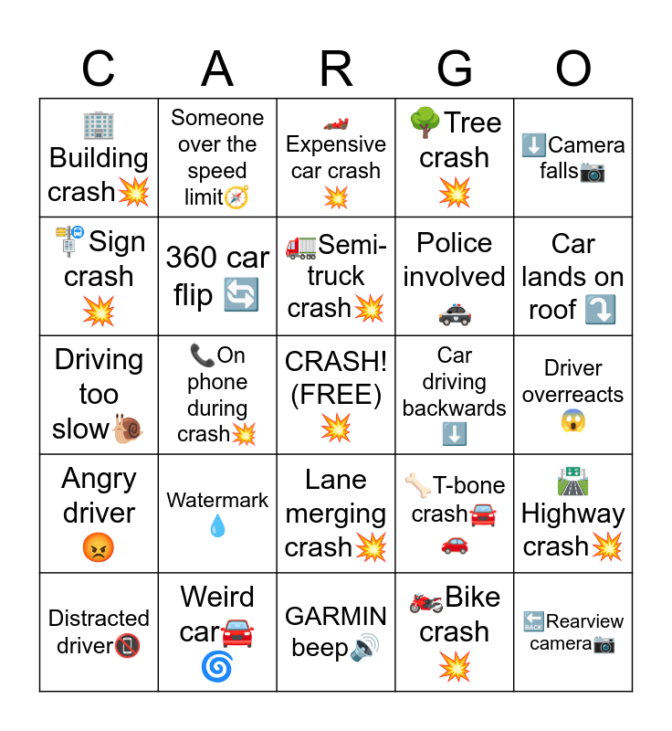 This bingo card has a free space and 59 words: 🗣️"Ok GARMIN"🗣️, Weird car🚘🌀, Near miss⚠️, Angry driver😡, 🏍️Bike crash💥, 🧍Non-driver involved crash💥, 360 car flip 🔄, 🎥POV outside of car🚗, Police involved🚓, 🚂Train crash💥, 🌳Tree crash💥, 🅿️Parked car crash💥, 🚏Sign crash💥, 💥Hit and run🏃🏻♂️, Driving on the wrong side/lane⛔️, 🏢Building crash💥, 🔙Rearview camera📷, ⬇️Camera falls📷, Car jumps💨, 🚛Semi-truck crash💥, Car driving backwards ⬇️, 🏎️Expensive car crash💥, Distracted driver📵, 🛣️Highway crash💥, Multi car crash🚙🚙🚙, Someone gets out of car🧍♂️, Driver causes crash💥, Fights car/driver😡, Car lands on roof ⤵️, Traffic jam🚗🚙🚛, Cutting off✂️, Piece falls off car⛓️💥, Pit maneuver, Window breaks🪟💥, Someone over the speed limit🧭, Fire🔥, Running red light🚦, 📞On phone during crash💥, Littering🚯, Driving too slow🐌, Swearing in non-english language🤬, Watermark💧, Driver overreacts😱, ✝️"Jesus christ/Oh my god!"✝️, Podcast on radio🎙️, Something flies out of car📤, "Potato" Dashcam🥔, 📏Pole crash💥, Lane merging crash💥, GARMIN beep🔊, Spinout 🔄, Swerving🛞↔️, Hydroplaning/ice crash💦🧊, 👩Female driver voice🗣️, 👱♂️Male driver voice🗣️, 🦴T-bone crash🚘🚗, Fender Bender🚗🚗, Head-on collision➡️⬅️ and 🐶Dog/Cat in car🐱.