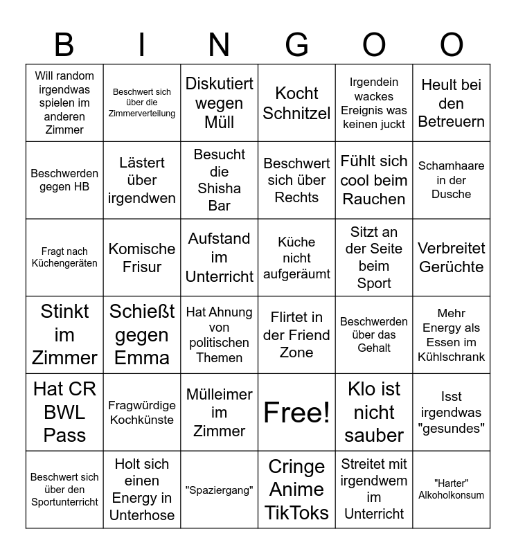 This bingo card has 36 words: Free!, Mülleimer im Zimmer, Cringe Anime TikToks, Beschwerden gegen HB, Stinkt im Zimmer, Küche nicht aufgeräumt, Lästert über irgendwen, "Spaziergang", Irgendein wackes Ereignis was keinen juckt, Klo ist nicht sauber, Schamhaare in der Dusche, Kocht Schnitzel, Isst irgendwas "gesundes", Komische Frisur, Beschwert sich über Rechts, Will random irgendwas spielen im anderen Zimmer, Hat CR BWL Pass, Sitzt an der Seite beim Sport, Fragt nach Küchengeräten, Diskutiert wegen Müll, Aufstand im Unterricht, Schießt gegen Emma, Flirtet in der Friend Zone, Hat Ahnung von politischen Themen, Beschwerden über das Gehalt, Beschwert sich über die Zimmerverteilung, Fühlt sich cool beim Rauchen, Holt sich einen Energy in Unterhose, Besucht die Shisha Bar, Heult bei den Betreuern, "Harter" Alkoholkonsum, Beschwert sich über den Sportunterricht, Mehr Energy als Essen im Kühlschrank, Verbreitet Gerüchte, Fragwürdige Kochkünste and Streitet mit irgendwem im Unterricht.