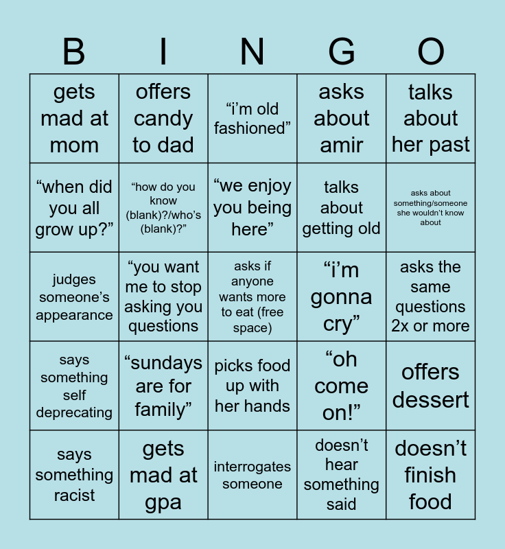 This bingo card has a free space and 29 words: says something racist, “i know what you really want and it’s never gonna happen”, “you want me to stop asking you questions, says something unhinged, gets mad at mom, “i’m old fashioned”, “how do you know (blank)?/who’s (blank)?”, “sundays are for family”, “i’m gonna cry”, gets mad at gpa, asks the same questions 2x or more, doesn’t finish food, interrogates someone, doesn’t hear something said, asks about something/someone she wouldn’t know about, whispers loudly to gpa, picks food up with her hands, says something self deprecating, talks about her past, judges someone’s appearance, “oh come on!”, complains about someone, talks about getting old, “when did you all grow up?”, asks about amir, offers candy to dad, offers dessert, “we enjoy you being here” and mentions herself dying.