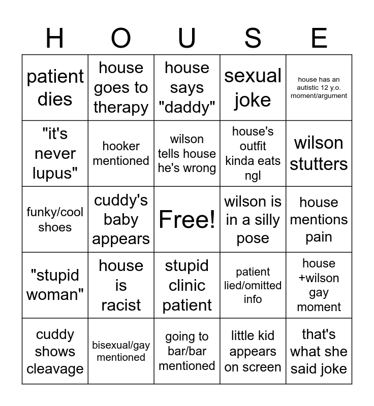 This bingo card has a free space and 24 words: house is racist, bisexual/gay mentioned, wilson tells house he's wrong, cuddy shows cleavage, house has an autistic 12 y.o. moment/argument, patient dies, "it's never lupus", house goes to therapy, wilson is in a silly pose, stupid clinic patient, house's outfit kinda eats ngl, funky/cool shoes, patient lied/omitted info, house +wilson gay moment, hooker mentioned, little kid appears on screen, house mentions pain, house says "daddy", wilson stutters, cuddy's baby appears, that's what she said joke, "stupid woman", sexual joke and going to bar/bar mentioned.