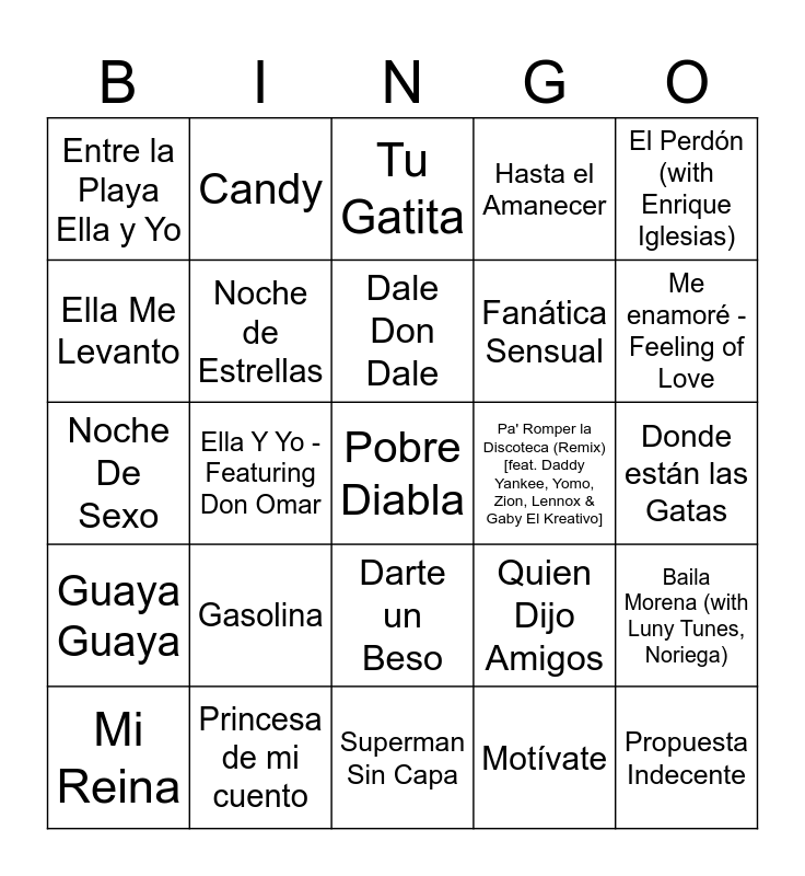 This bingo card has 64 words: Agachate, Amanecí Contento, Angelito Sin Alas (feat. Juan Magán), Baila Morena (with Luny Tunes, Noriega), Bailando por Ahí, Calor De Verano, Candy, Como Tu No Hay Dos, Dale Don Dale, Danza Kuduro, Darte un Beso, Dile, Donde están las Gatas, El Perdón (with Enrique Iglesias), El Señor de la Noche, Ella Me Levanto, Ella Y Yo - Featuring Don Omar, Entre la Playa Ella y Yo, Es un Secreto, Fanática Sensual, Gasolina, Guaya Guaya, Hasta el Amanecer, Hasta Que Se Seque el Malec¢n (feat. Farruko), La conocí bailando (feat. K-Narias), La Despedida, La Nueva Y La Ex, La Rosa Negra (feat. Carnal), Lady, Limbo, Lo Que Pasó, Pasó, Lovumba, Mayor Que Yo 3, Mayor Que Yo, Me enamoré - Feeling of Love, Mi Reina, Mi Vecinita, Motívate, No Sigue Modas, Noche de Estrellas, Noche De Sexo, Pa' Romper la Discoteca (Remix) [feat. Daddy Yankee, Yomo, Zion, Lennox & Gaby El Kreativo], Pasado pisado, Perros Salvajes, Plakito (feat. El General Gadiel), Pobre Diabla, Princesa de mi cuento, Propuesta Indecente, Quien Dijo Amigos, Rayos de Sol, Se Vuelve Loca, Si Te Vas/Que Tengo Que Hacer, Superman Sin Capa, Sígueme Y Te Sigo, Te Pintaron Pajaritos, Travesuras, Tu Gatita, Un Beso, Una En Un Millón, Una Vaina Loca, Vaivén, Voy A Beber, Yo Te Esperaré and Él No Te Da.
