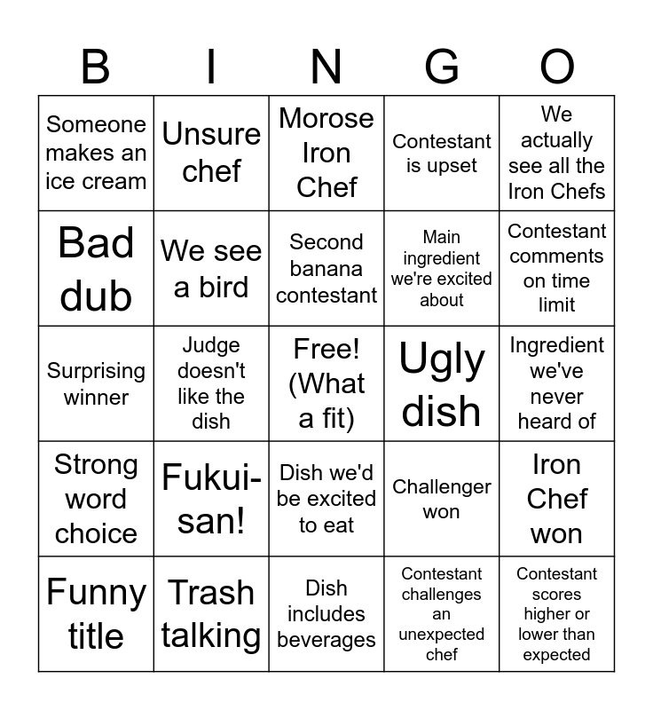 This bingo card has a free space and 24 words: Fukui-san!, Trash talking, Second banana contestant, Funny title, We actually see all the Iron Chefs, Someone makes an ice cream, Bad dub, Unsure chef, Ugly dish, Dish we'd be excited to eat, Main ingredient we're excited about, Surprising winner, Challenger won, Iron Chef won, We see a bird, Contestant challenges an unexpected chef, Ingredient we've never heard of, Morose Iron Chef, Contestant comments on time limit, Judge doesn't like the dish, Contestant scores higher or lower than expected, Strong word choice, Contestant is upset and Dish includes beverages.