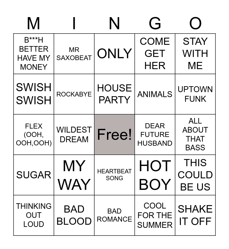 This bingo card has a free space and 49 words: TAKE ME TO THE CHURCH, SHAKE IT OFF, WATCH ME WHIP (WHIP / NAE NAE), BAD ROMANCE, MY WAY, MORE THANK YOU KNOW, MR SAXOBEAT, MAMA, SWISH SWISH, SLIDE, ROCKABYE, COME GET HER, THIS COULD BE US, HOT BOY, ENERGY, TRAP QUEEN, HOUSE PARTY, DEAR FUTURE HUSBAND, UMA THURMAN, STAY WITH ME, WILDEST DREAM, COOL FOR THE SUMMER, B***H BETTER HAVE MY MONEY, ANIMALS, TAKE YOUR TIME, UPTOWN FUNK, THINKING OUT LOUD, SEE YOU AGAIN, HEARTBEAT SONG, SUGAR, SHUT UP AND DANCE, THE HILLS, CHEERLEADER, CAN'T FEEL MY FACE, BAD BLOOD, FIGHT SONG, 679, POST TO BE, ALL ABOUT THAT BASS, WHAT DO YOU MEAN?, HELLO, JEALOUS, TIME OF OUR LIVES, I DON'T F**K WITH YOU, FLEX (OOH, OOH,OOH), ONLY, I DON'T MIND, 7/11 and TRUFFLE BUTTER.
