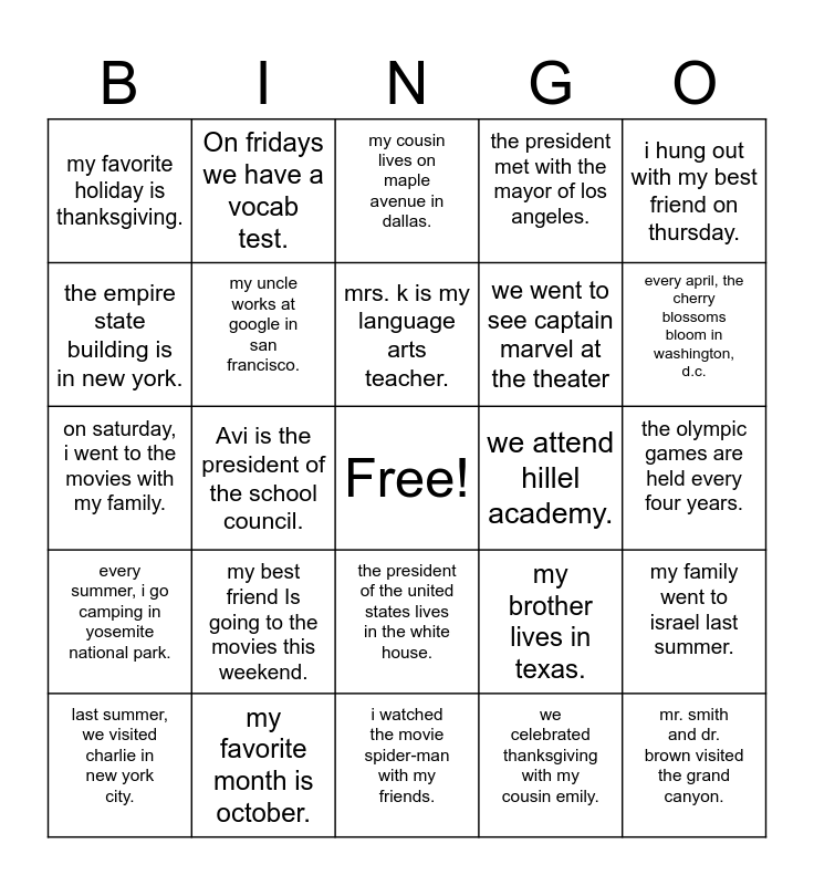 This bingo card has a free space and 24 words: my best friend Is going to the movies this weekend., my favorite month is october., mrs. k is my language arts teacher., last summer, we visited charlie in new york city., i hung out with my best friend on thursday., my favorite holiday is thanksgiving., the empire state building is in new york., On fridays we have a vocab test., we attend hillel academy., the president of the united states lives in the white house., we went to see captain marvel at the theater, on saturday, i went to the movies with my family., my brother lives in texas., my family went to israel last summer., my uncle works at google in san francisco., we celebrated thanksgiving with my cousin emily., the olympic games are held every four years., my cousin lives on maple avenue in dallas., every april, the cherry blossoms bloom in washington, d.c., Avi is the president of the school council., mr. smith and dr. brown visited the grand canyon., every summer, i go camping in yosemite national park., the president met with the mayor of los angeles. and i watched the movie spider-man with my friends..